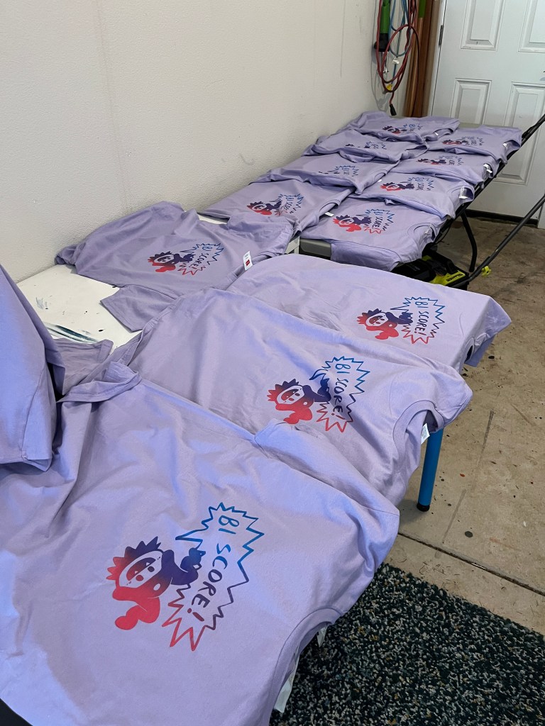 My next work done for them was drawing up a shirt design featuring Jack Frost from SMT/Persona, and although it was a single screen job I made sure we pushed it farther than normal and did the colors of the bisexual flag! As the printing went on the inks blended more and more, and the results were simply scrumptious.