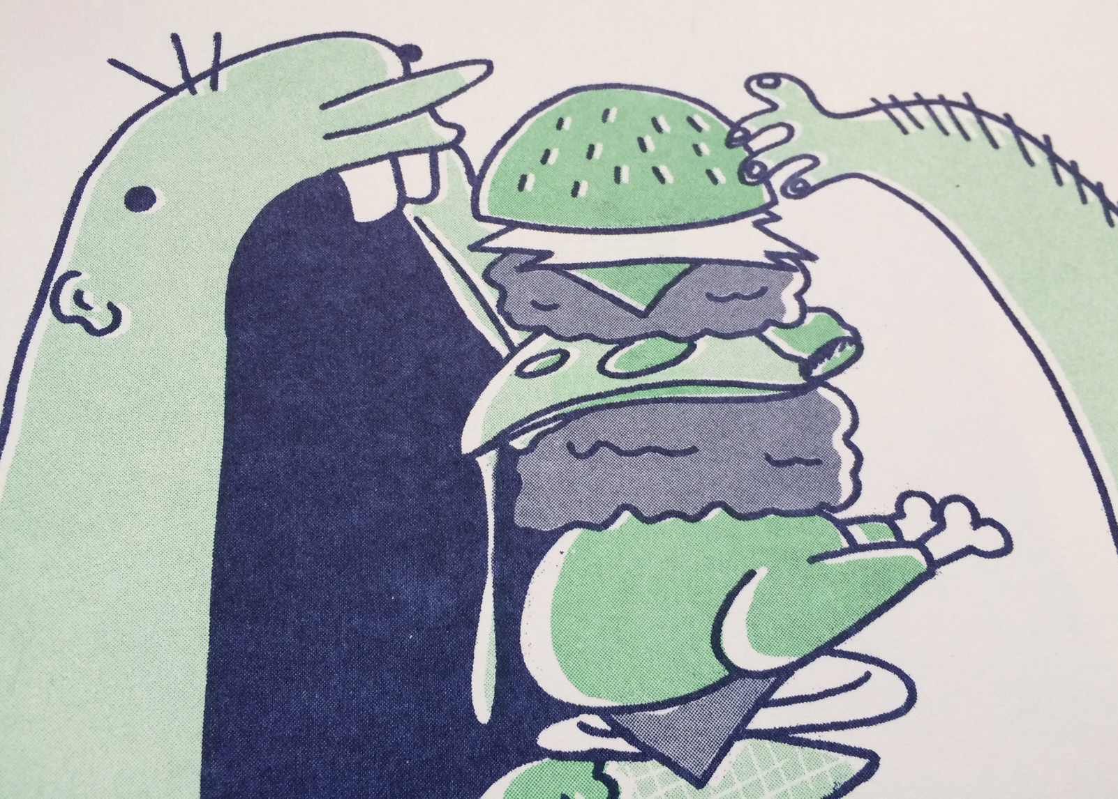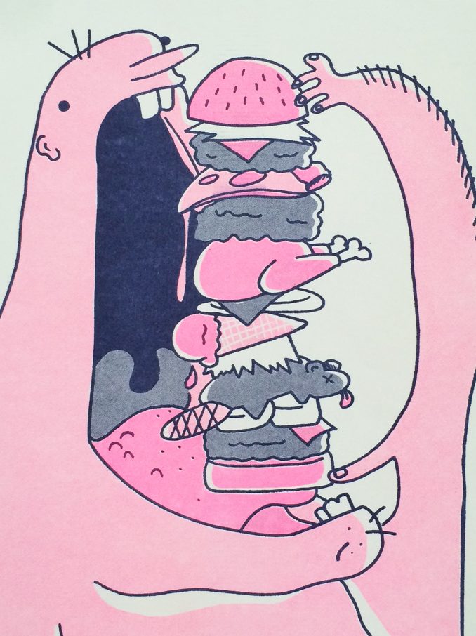 This project my senior year at Portland State was the first time I ever heard about risograph printing. It’s a lot like screenprinting, which I love! I wanted it to be as absurd as possible, since the objective was to reference the deadly sin of Gluttony and we were limited to using 2 colors and 4 shades. Yes, he absolutely did stack a dead beaver up in there.