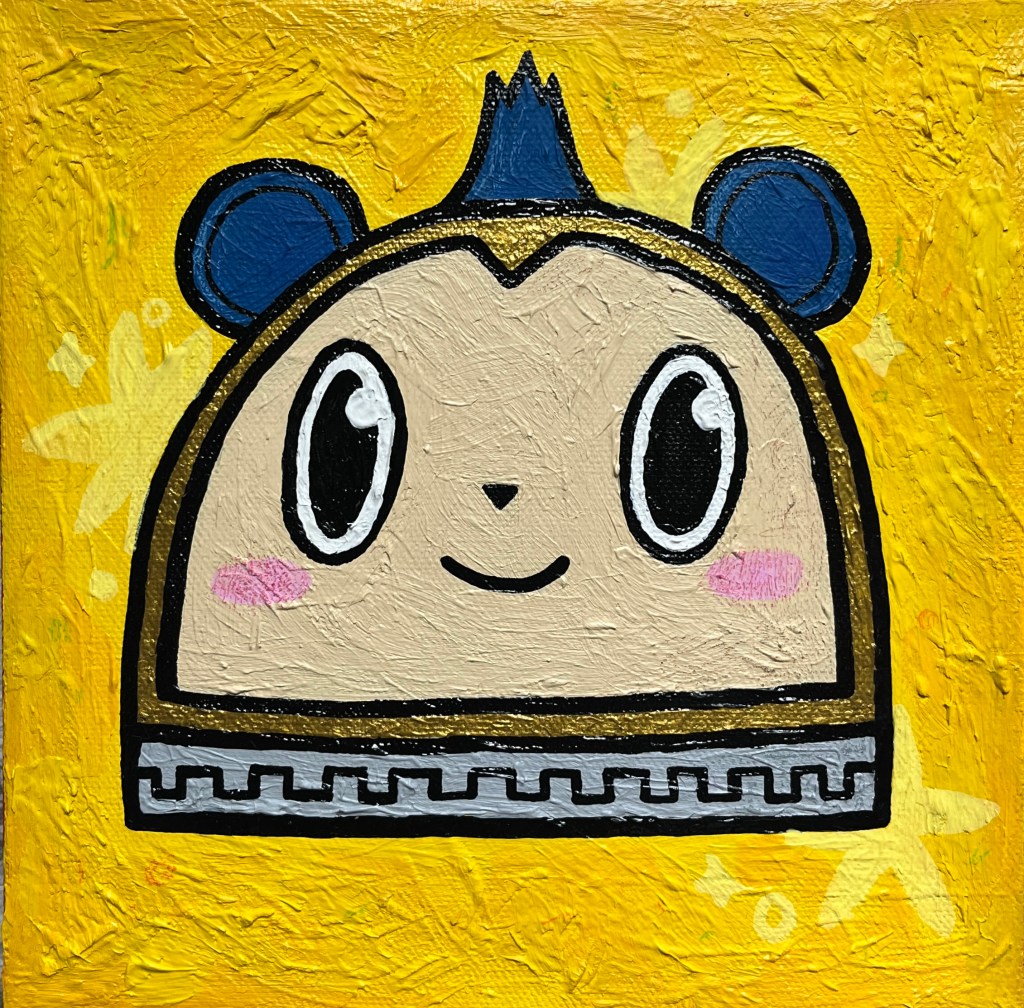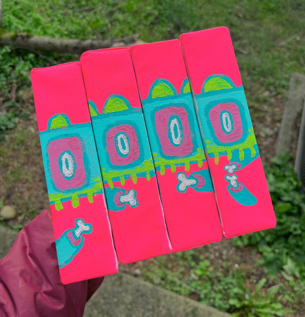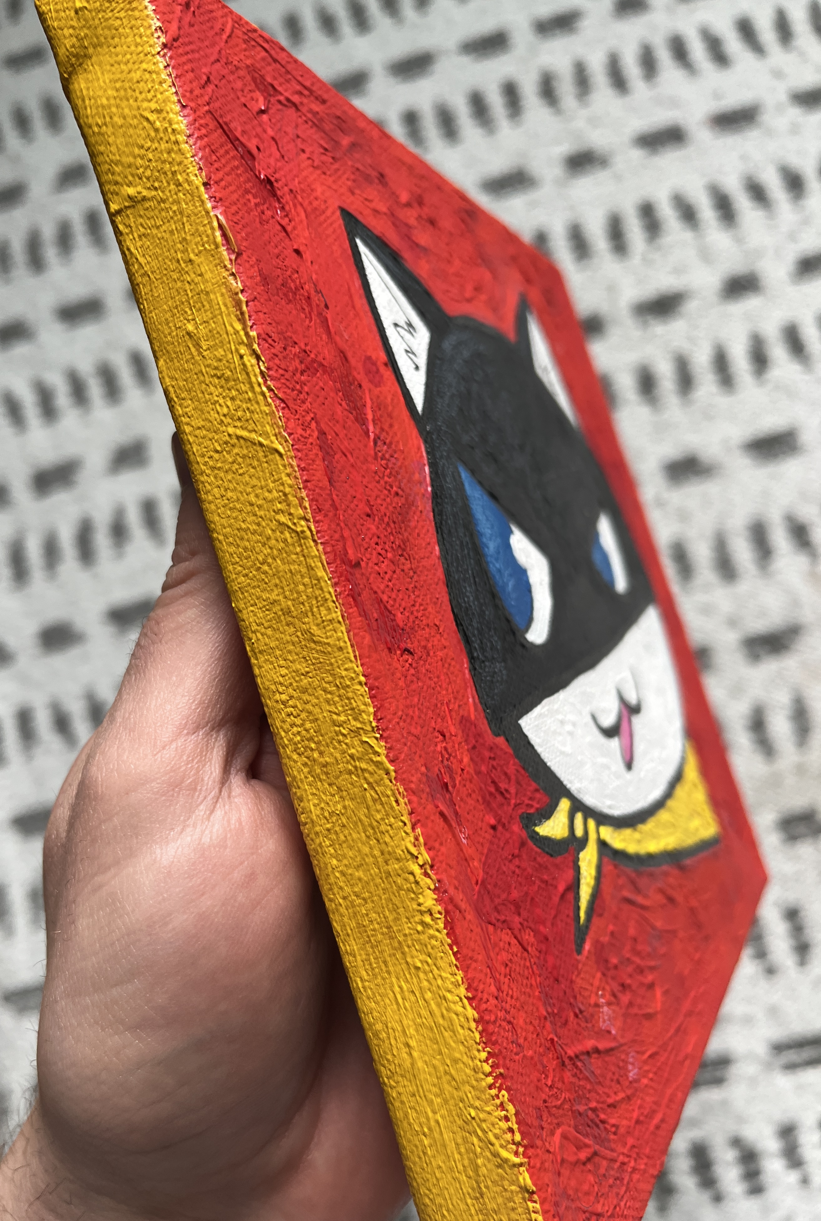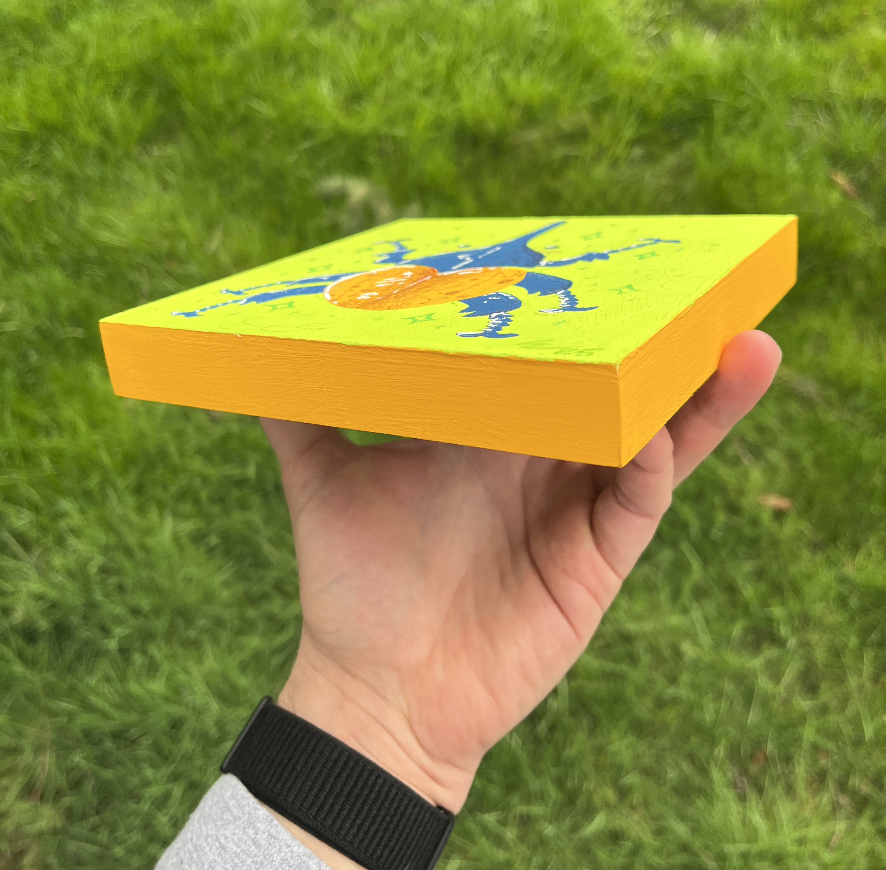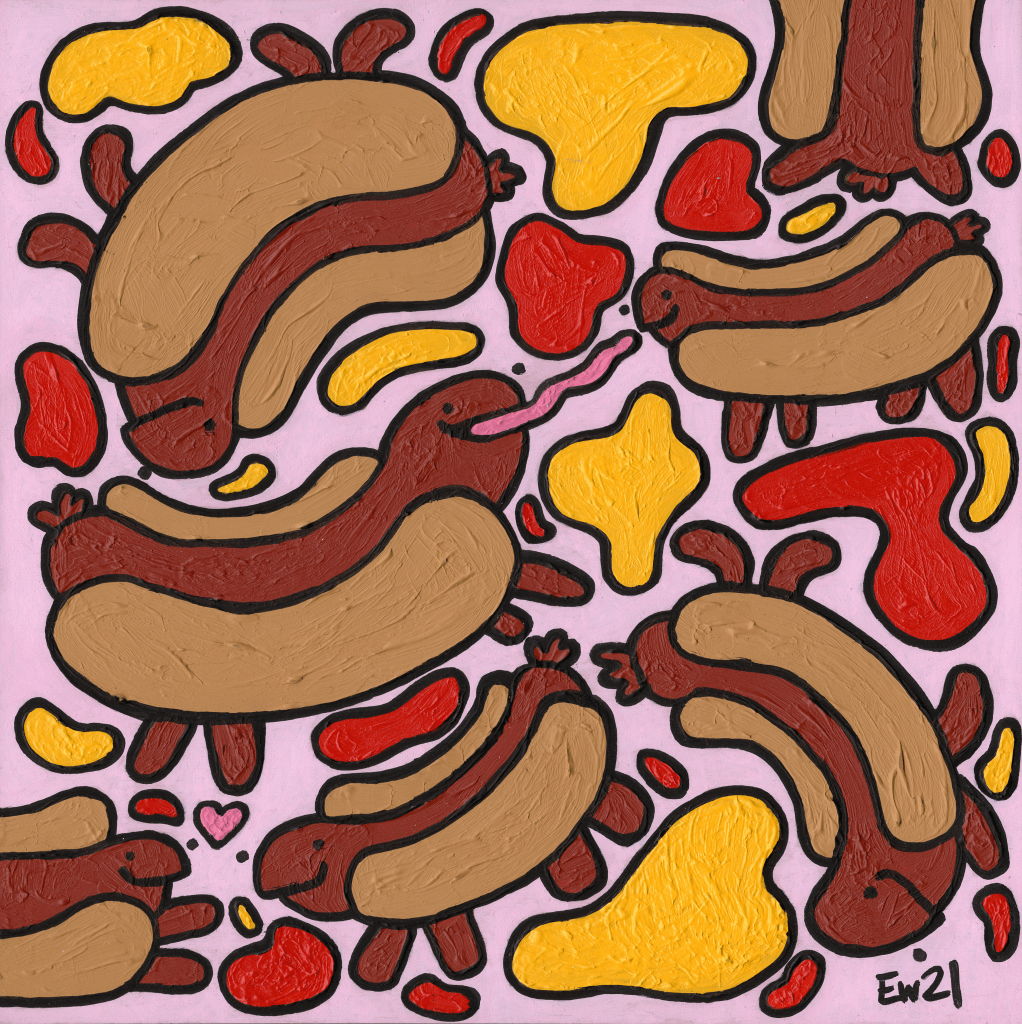 “Hot Diggity Dog” – Acrylic, Posca pen, and oil pen on wood panel