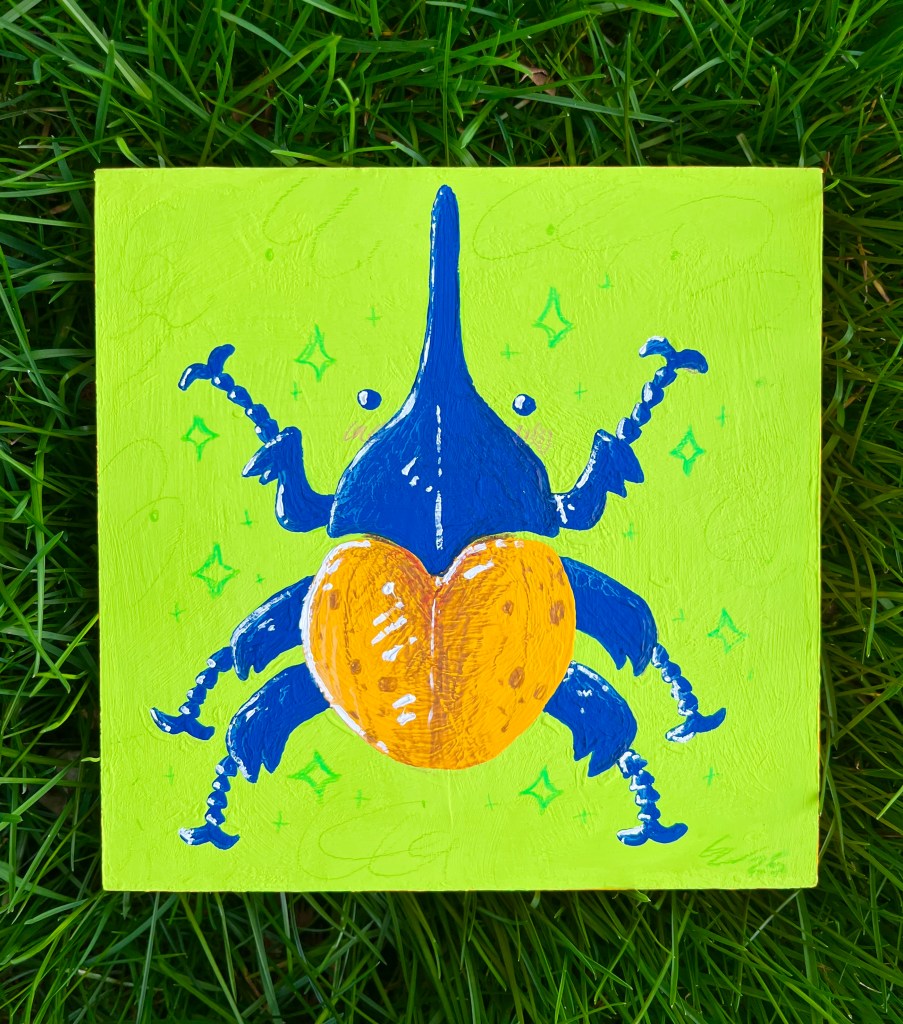 “Herc Beetle” for Jesse – Acrylic gouache and colored pencil on wood panel