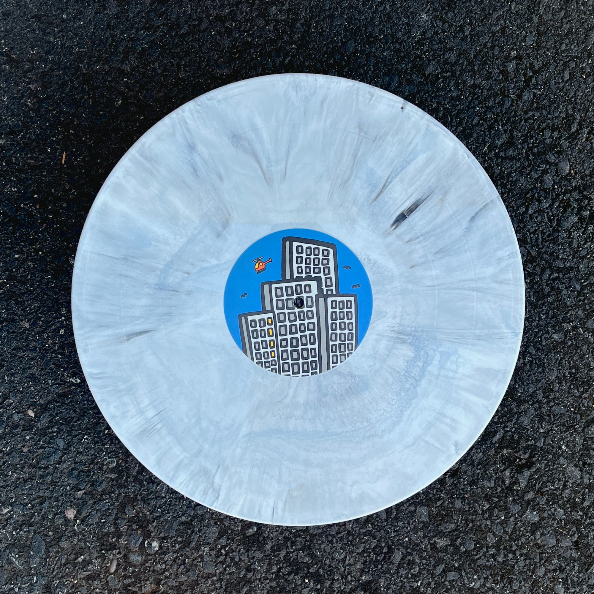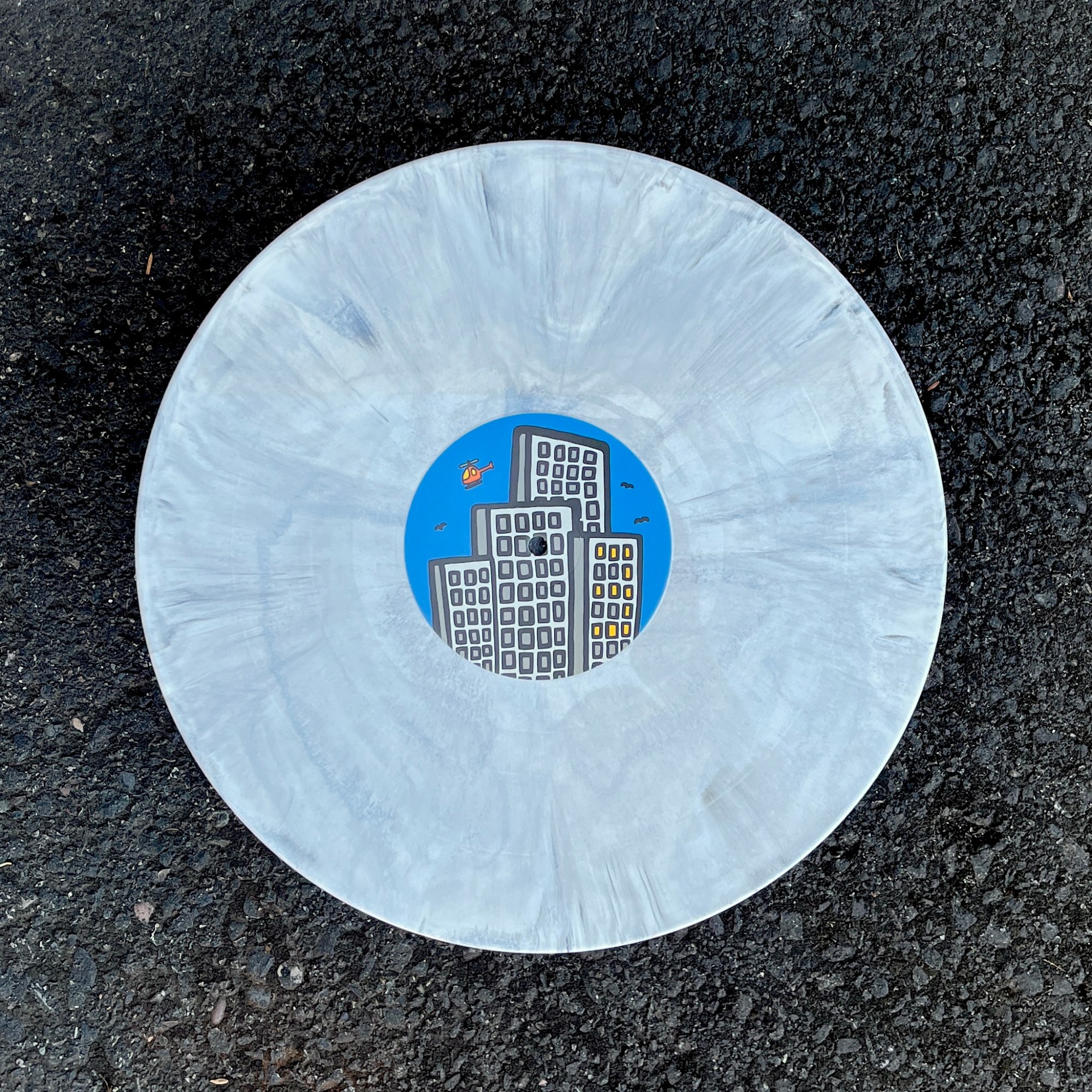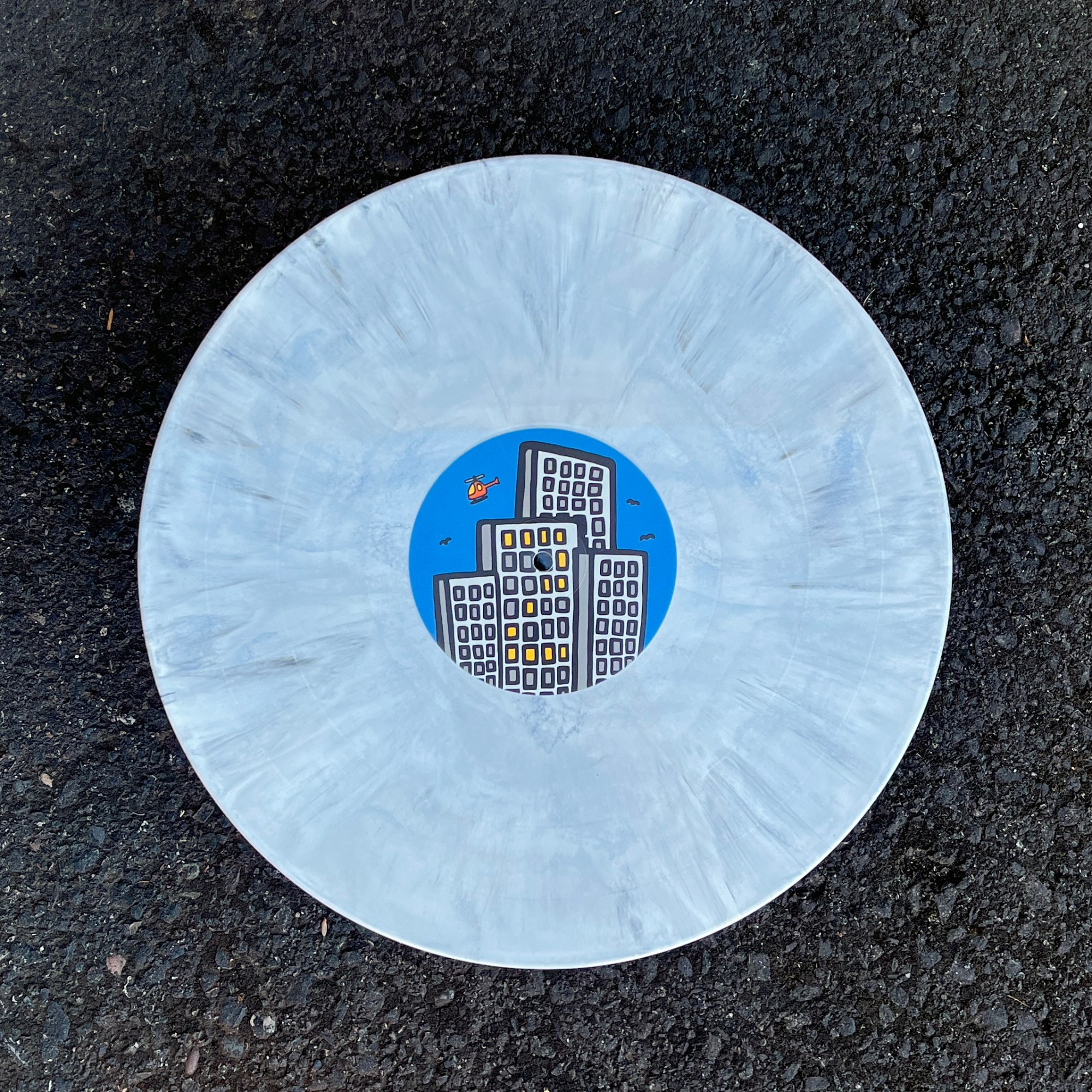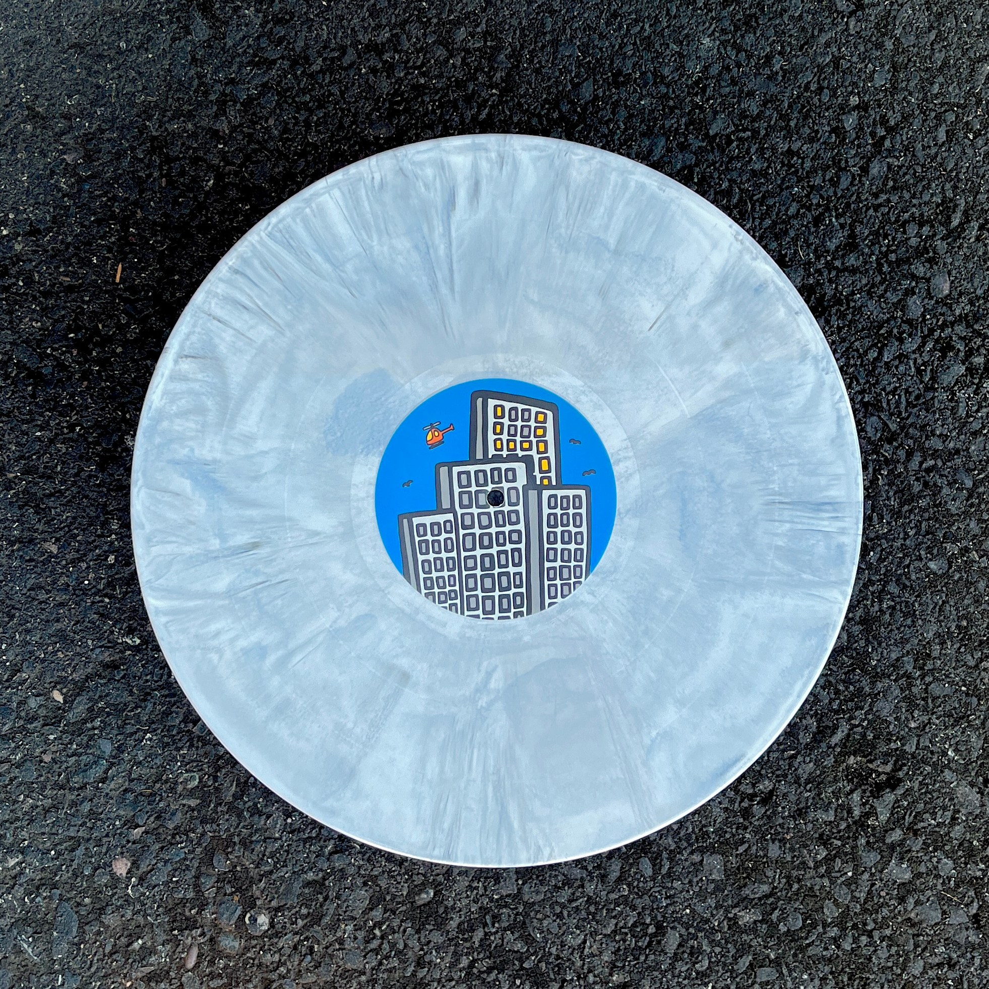 After deciding that a piece from Haring’s Lucky Strike series would be the most suitable fit, I drew 17 pages worth of content with my thickest Posca to scan in and piece together, then once everything was in the right place I vectorized it so I could play with the shapes more. Initially the background was stark white, so I scanned in 8 confetti textured envelopes and isolated those bits into a 12.5×12.5 PNG to emulate the jacket stock being a textured paper. Everything printed onto the stock is coated in a spot gloss to have that extra pop. Each center label is the same, but the sides are noted by the lights on in the buildings. The variant is what we lovingly named “concrete and asphalt”.