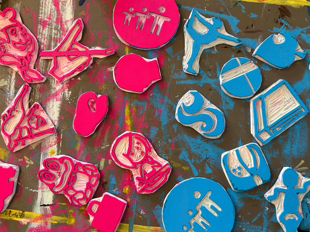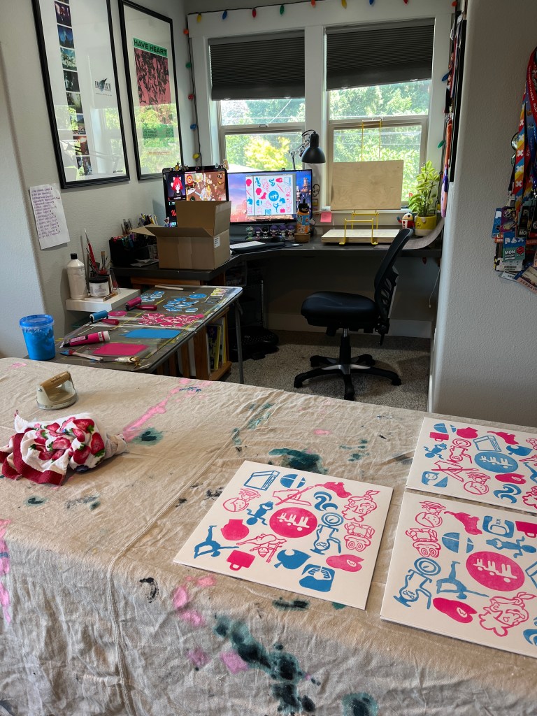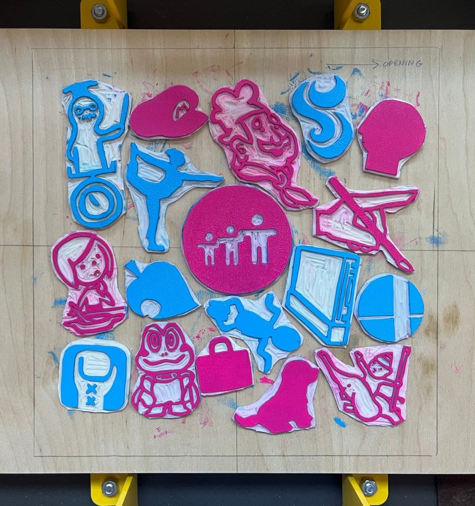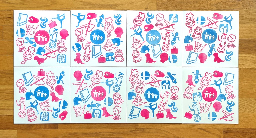 Summer 2024 I was asked to do the art for the unofficial Touch Generations release’s test press jackets—it was a tremendous amount of work and planning, but the result was well worth it! I carved a gaggle of relief blocks that represented icons from each game that was on the release (and then carved some more because those ones were way too big), started planning layouts on my block printing press and in Illustrator, printed those various layouts over the course of a heatwave and Summer Games Done Quick, painted the other sides with a big icon (each jacket had its own unique icon set), and then did everything again but for shirts to go with them. The shirt part was especially brutal, not only because of how varying of a medium block printing is but because of the sheer number of stamps I had to place every single time. I reverse engineered a jig for the stamp placement on the shirts and had I not done that it would not have been possible.