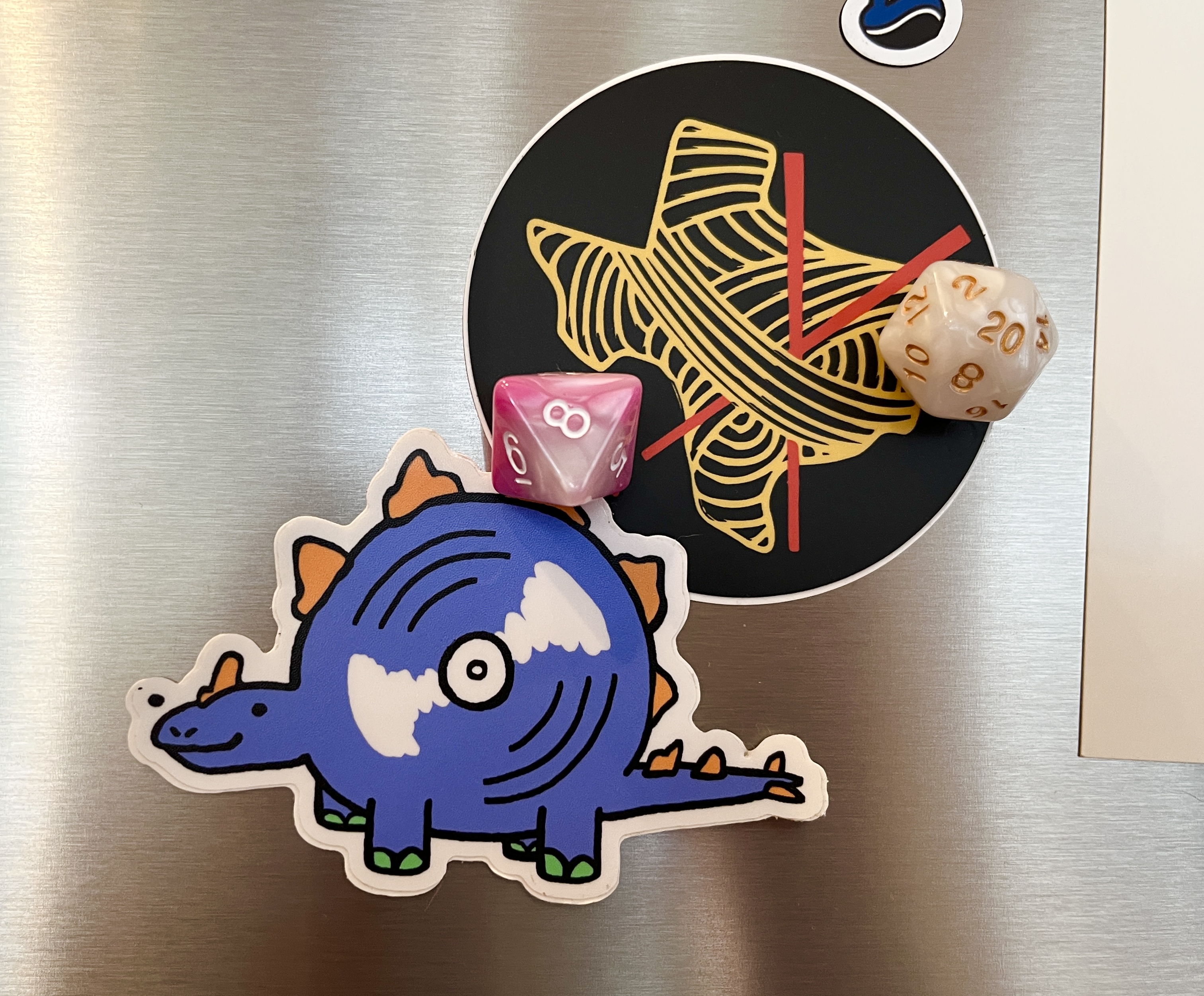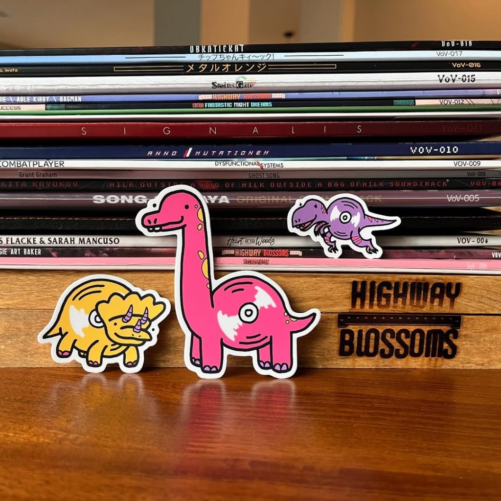 Shortly after Very Ok Vinyl began I was commissioned to do some stickers for them. I don’t remember the initial process, but somehow we came to the idea to do these vinyl dinosaurs and dubbed them vinylsaurs, and I have to say we struck art gold with these! In 2024 we did a matching set to go with the original 3, and we’d love to translate these little bbs into other mediums like pins and plushies. This collaboration has still been one of my all time favorites and has led to a wonderful friendship.