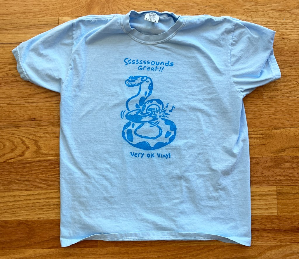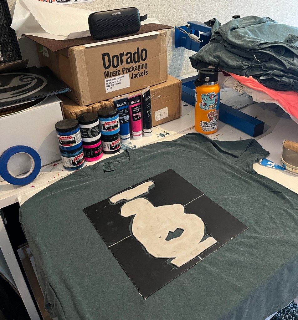 A collaboration I look forward to every year is getting to do a run of shirts with Very Ok Vinyl for the label’s anniversary in the spring. For the 3rd anniversary it was our 2nd time doing shirts, and we wanted to mix it up a little bit. I had recently gotten a block printing press, and while I didn’t end up using it for this project, I still carved a relief block to hand print every shirt. Text is incredibly unfun to carve, but I’m happy with the result we ended up with. I created a cardboard jig to line the blocks up with and it made the actual printing process much less scary. All in all it was a step outside my comfort zone, and I’m glad we did it this way—looking forward to going back to screenprinting for the 4th anniversary though!